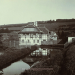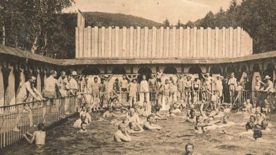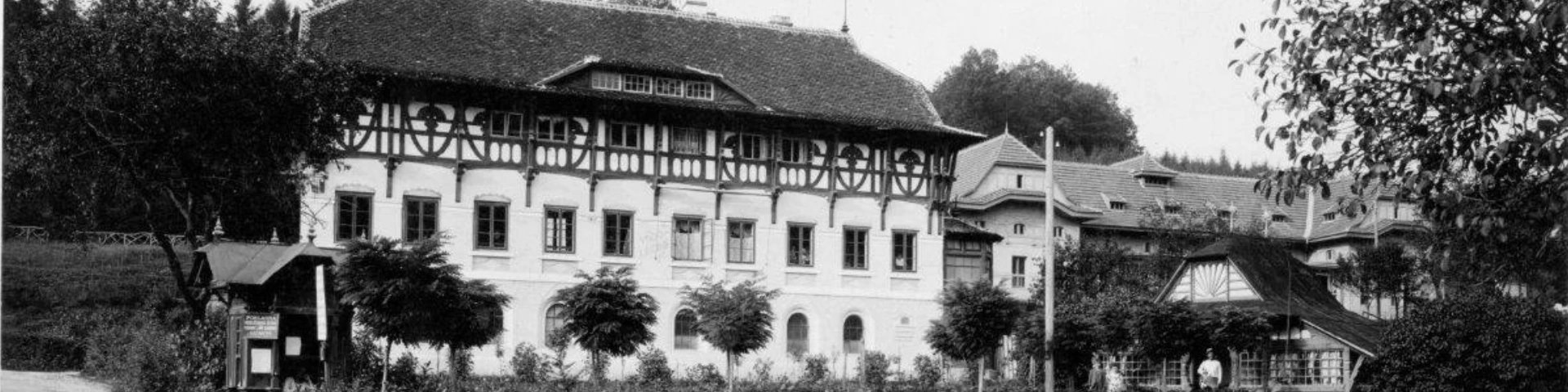 In the immediate vicinity of the Hydrotherapy Institute stand Jurkovič's River and Sun Baths, built the very following year. In their time, this public swimming facility with its pool and picturesque changing cabins was very popular. Various sporting competitions were held here and spa guests gathered here. At first, men and women took turns bathing and sunbathing; in 1910 the pool was extended and divided by a partition into a women's and a men's section. In the post-war period, the Sun Baths section was also enlarged. The pool remained in operation until 1995, when the method of supplying the pool with river water no longer met hygiene regulations. Today an ornamental biotope has been created here.