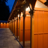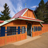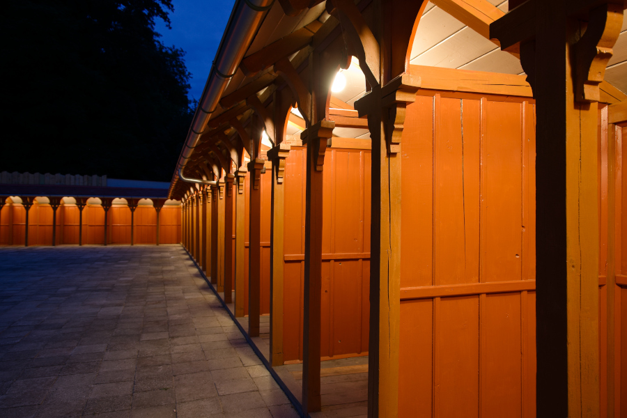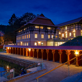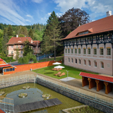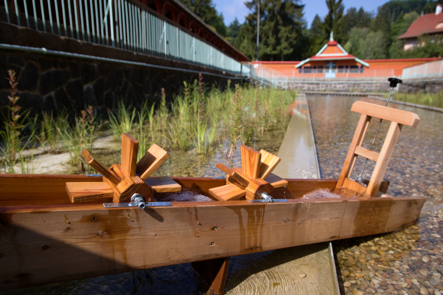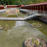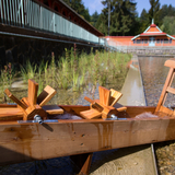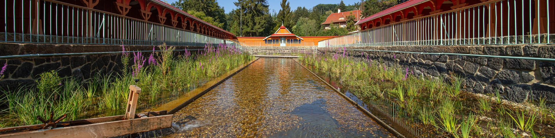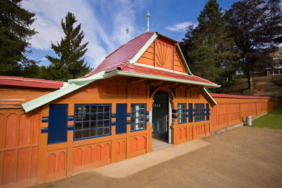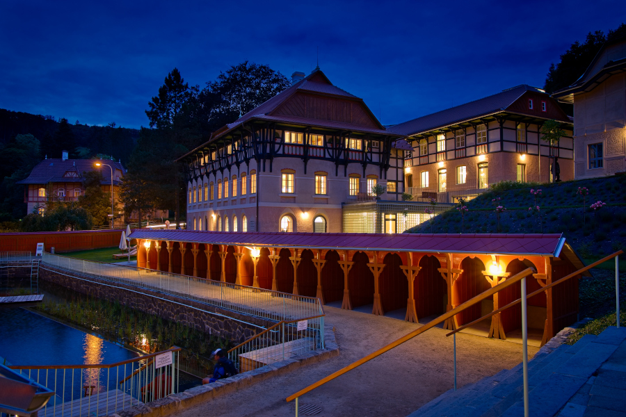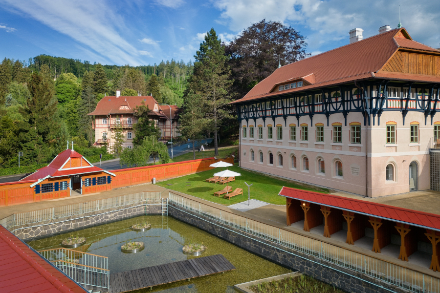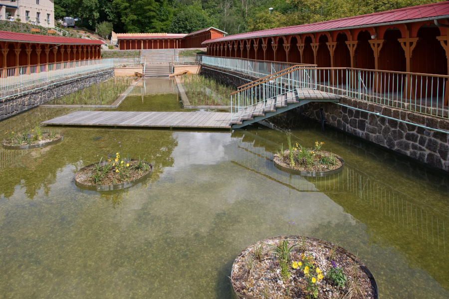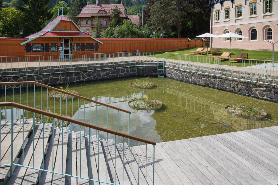 In 1903, Jurkovič built the River and Sun Baths in the immediate vicinity of the Hydrotherapy Institute, which in their time represented a centre of social gathering and entertainment for spa guests. The pool, fed by the Šťávnica stream, was lined with wooden changing cabins with white curtains. The renowned swimming facility hosted a variety of sporting competitions, including swimming races, ping-pong, gymnastics and ballooning.